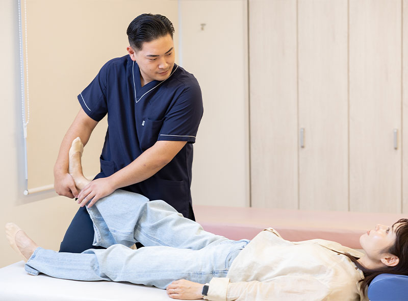当院では、理学療法士による完全予約制・マンツーマンの医療リハビリを提供しています。ケガ・手術後や整形外科疾患に対し、関節可動域・筋力評価を元に患者さま一人ひとりに合った適切な運動療法と物理療法を組み合わせた治療プランを作成します。